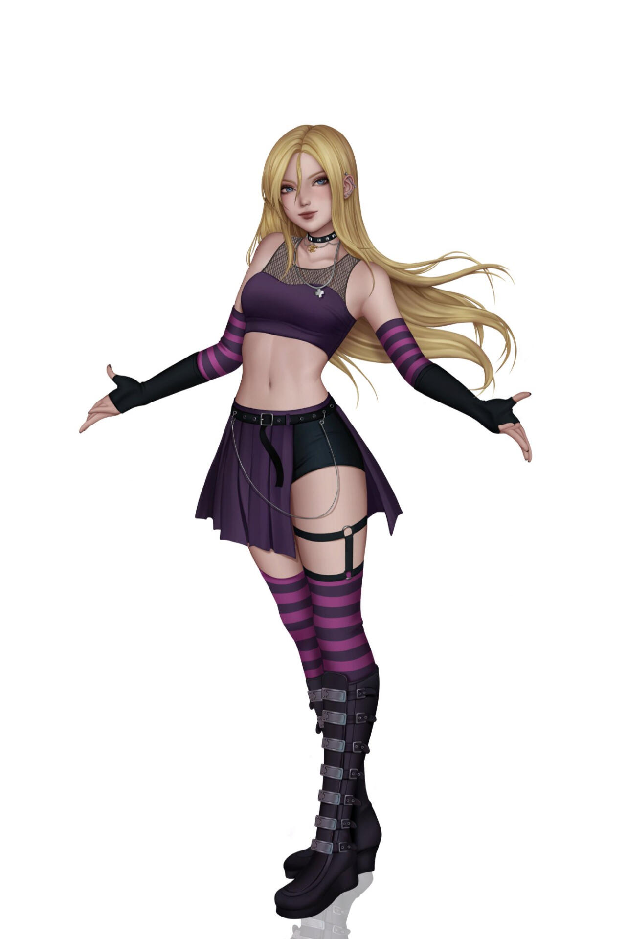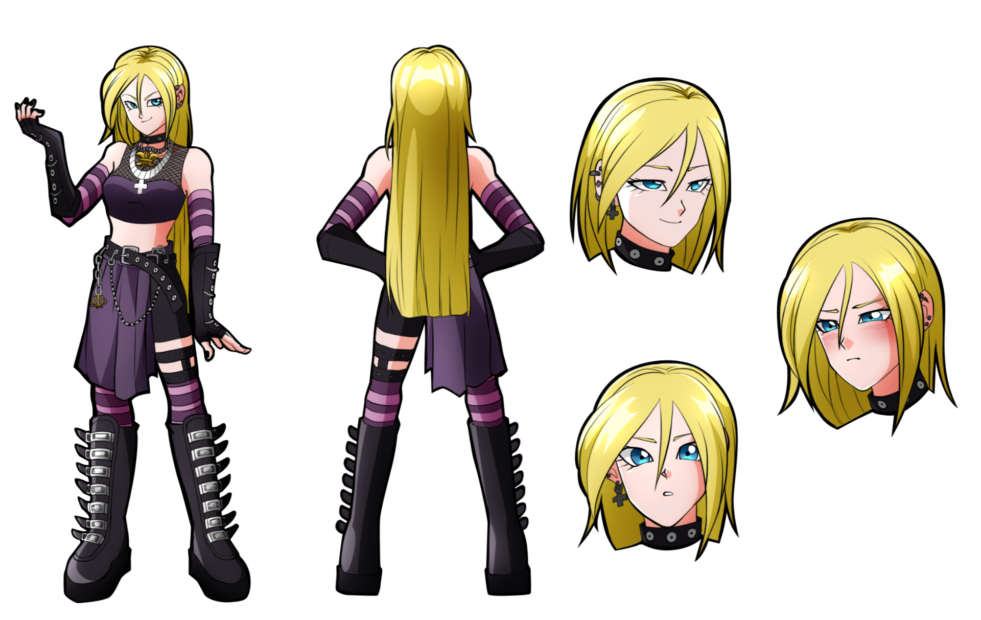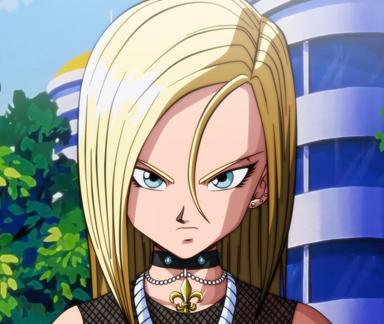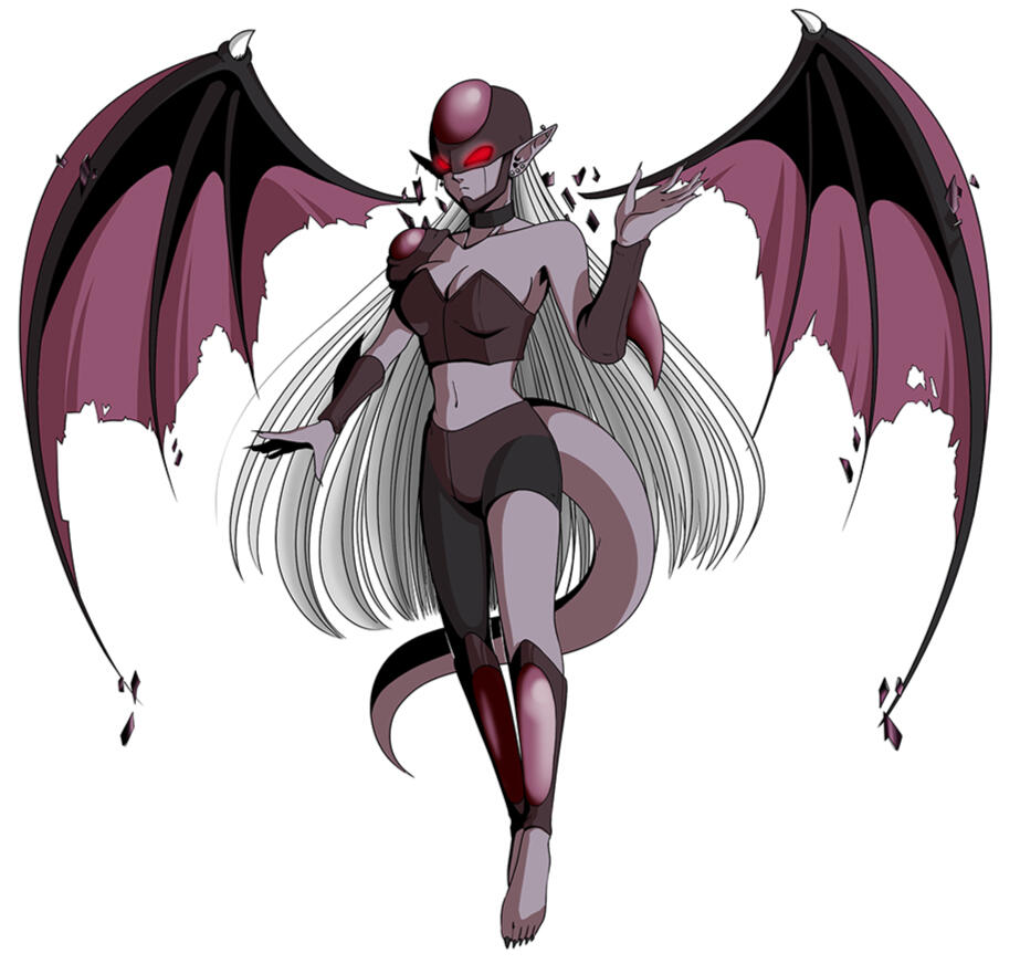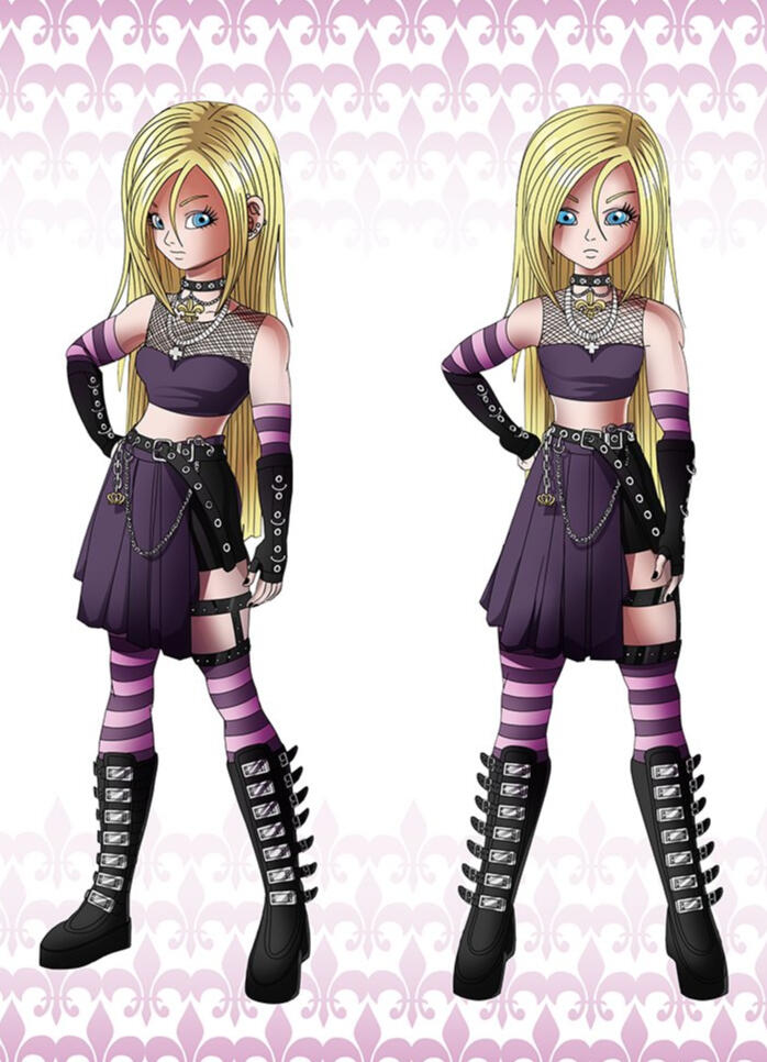 Lily is on the shorter side, her hair soft and blonde. In her youth, she dressed prim and proper as directed, from school uniforms to Sunday best; she also wore glasses out of necessity.From her late teenage years and forward, she is often seen wearing dark colors or wearing edgy fashion. She wears elaborate goth earrings and her fingernails are often painted black. Her more common attire consists of a purple tube top with a mesh undershirt, striped leggings and arm warmers and black, fingerless gloves, a skirt adorned with belts, chains, and trinkets, black combat boots, and her treasured fleur-de-lis choker paired with a silver plus necklace. Her eyes are similar to that of Dr. Gero's Androids, such as Android 18 and Android 21.In her mutated form, Lily gains a more curvaceous body, her skin turns pale, her hair becomes silvery white, her ears become pointed, her eyes change to a vibrant red, and she gains a tail. Whatever clothes she was wearing prior to is replaced with dark Frieza Race type armor with magenta crystal adornments. Her appearance in her mutated form is the result of her having Frieza, Namekian, and Demonic DNA applied to her genetic code.